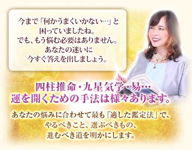 易術学鑑定・九星気学・四柱推命・西洋占星術・タロット・姓名判断・人相・手相・開運方位、福禄寿カレンダー(オーダーメイドの365日カレンダー)等で総合に鑑定することで、恋愛。ビジネス、金運UP、就職や進路等、お客様のニーズに合わせた開運術を提供している。